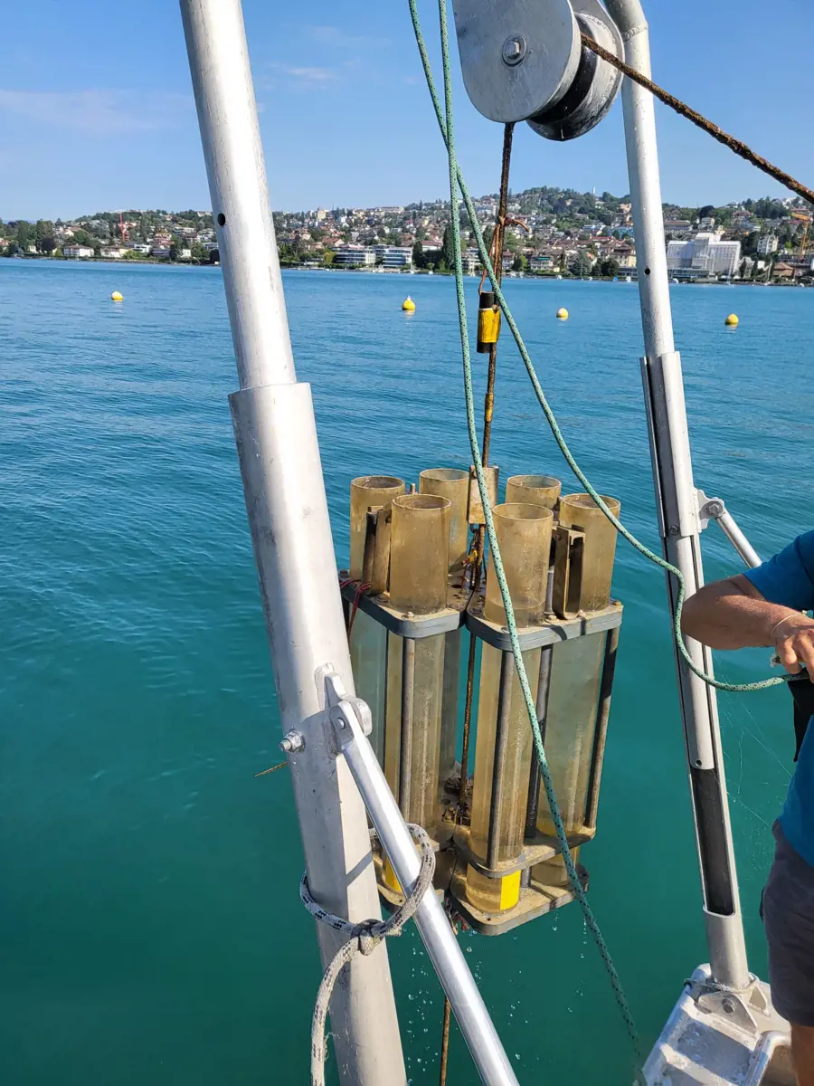Des particules microscopiques flottent par millions dans l’eau des lacs : ce sont les matières en suspension (MES). Elles agissent comme des collecteurs mobiles pour les substances qui les environnent : les composés dissous s’accumulent à leur surface et se déplacent ensuite avec elles. Elles assurent ainsi une liaison dynamique entre la colonne d’eau et le sédiment et c’est cette dynamique qui les rend particulièrement intéressantes pour les scientifiques : car, alors que les sédiments archivent les conditions environnementales sur la durée, les MES reflètent les changements à court terme de la charge particulaire du lac.
